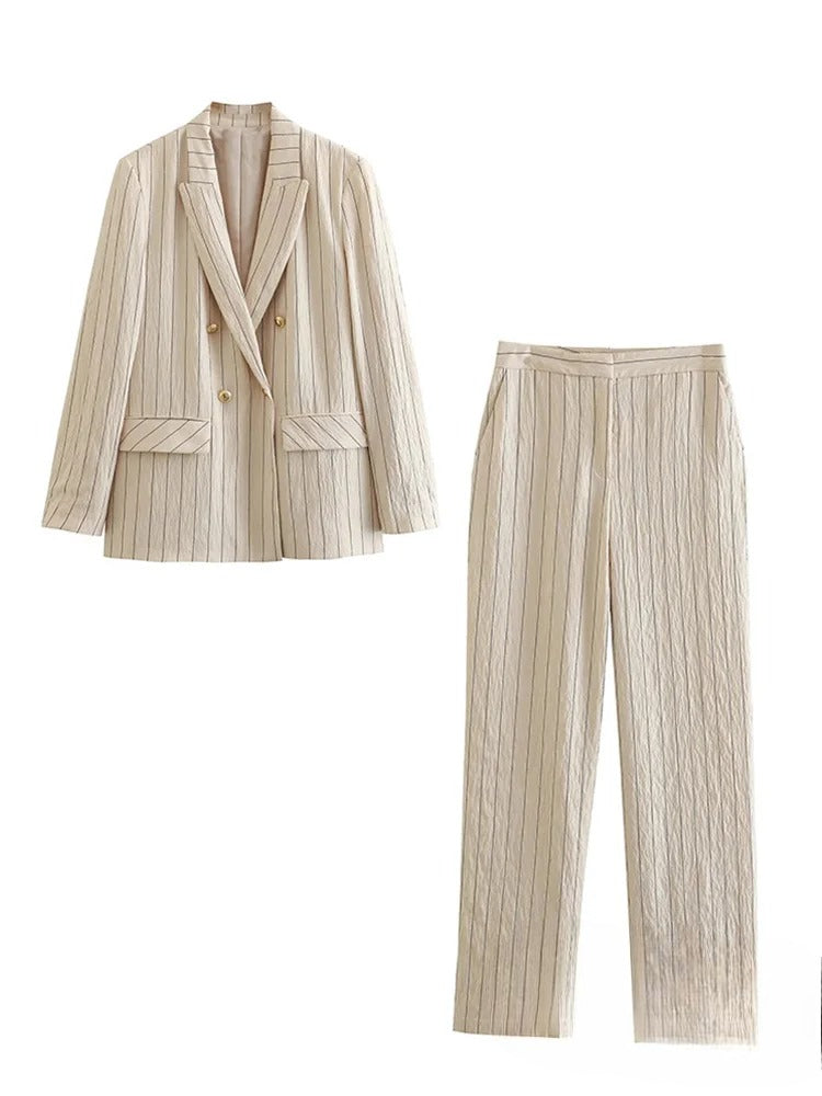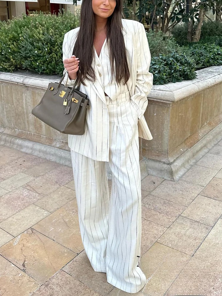 Elevate your wardrobe with the Maggie Striped Dress Blazer Pants Set, a perfect fusion of elegance and modern style. This versatile set includes a sleek blazer, a sophisticated dress, and tailored pants, all adorned with classic stripes that add a touch of timeless charm.